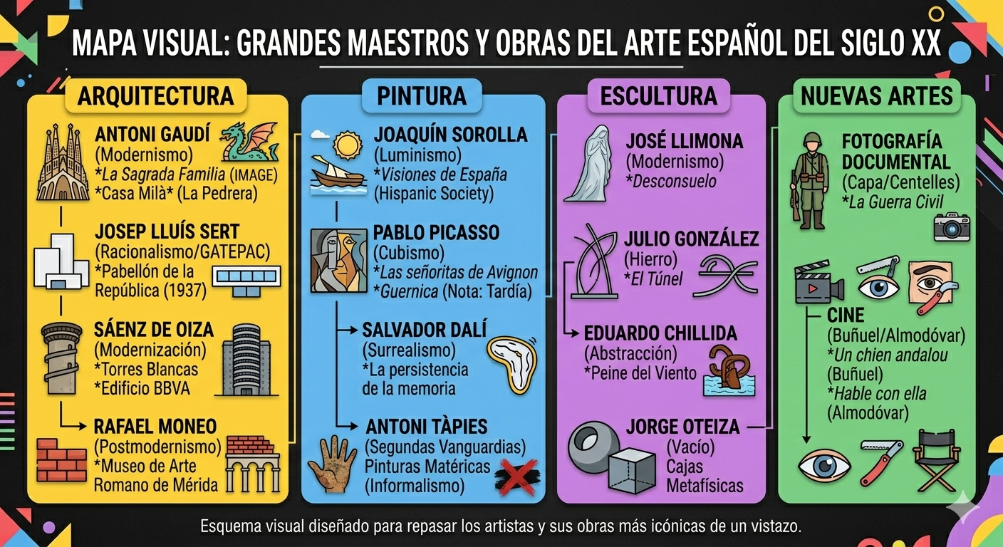 El Guernica se encuentra en la 2ª planta del edificio Sabatini del MNCARS. Picasso lo pintó en 35 días. Se dice que no tenía definido el tema para realizar una obra que le pidieron desde París para exponerla en el Pabellón de la 2ª República en 1937. El bombardeo sobre la ciudad de Guernica fue más que un aliciente para que el pintor desplegase todo su potencial y rabia. 35 días para definir un lienzo de casi ocho metros que marcó un hito en el arte español y a nivel mundial. El Guernica volvió a España en 1981, donde permaneció custodiado en el Casón del Buen Retiro, en Madrid. No fue hasta 1992 cuando se trasladó a su sede actual del MNCARS. En este museo encontraréis las obras de Dalí, de Eduardo Chillida, María Blanchard (autora cubista que fue opacada por Picasso). Ángeles Santos con su lienzo "El Mundo", una obra magistral que pintó con tan solo 17 años. Destaca Maruja Mallo con su serie "Las Verbenas"; Juan Gris trabajó el cubismo, mientras que Joan Miró el surrealismo.