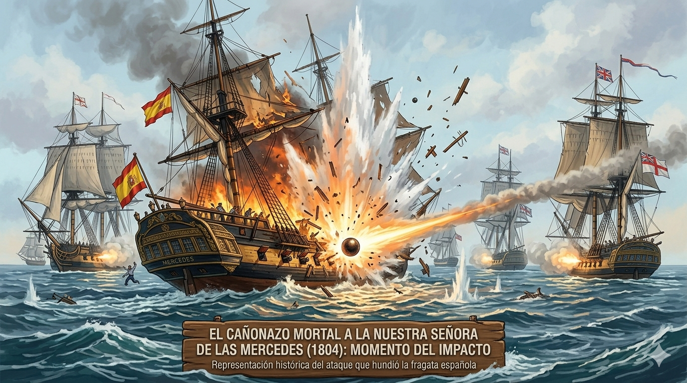 Cómo es la vida, que en tiempos de paz, la armada inglesa bombardeó nuestras naves que partían de Montevideo. La misión era traer dinero, frutos y otras pertenencias desde América hasta España, tras haber acordado dar apoyo económico a Francia. La fragata Nuestra Señora de las Mercedes se hundió cuando se dirigía a Cádiz, en el Cabo de Santa María. Murieron la mayoría de sus ocupantes.