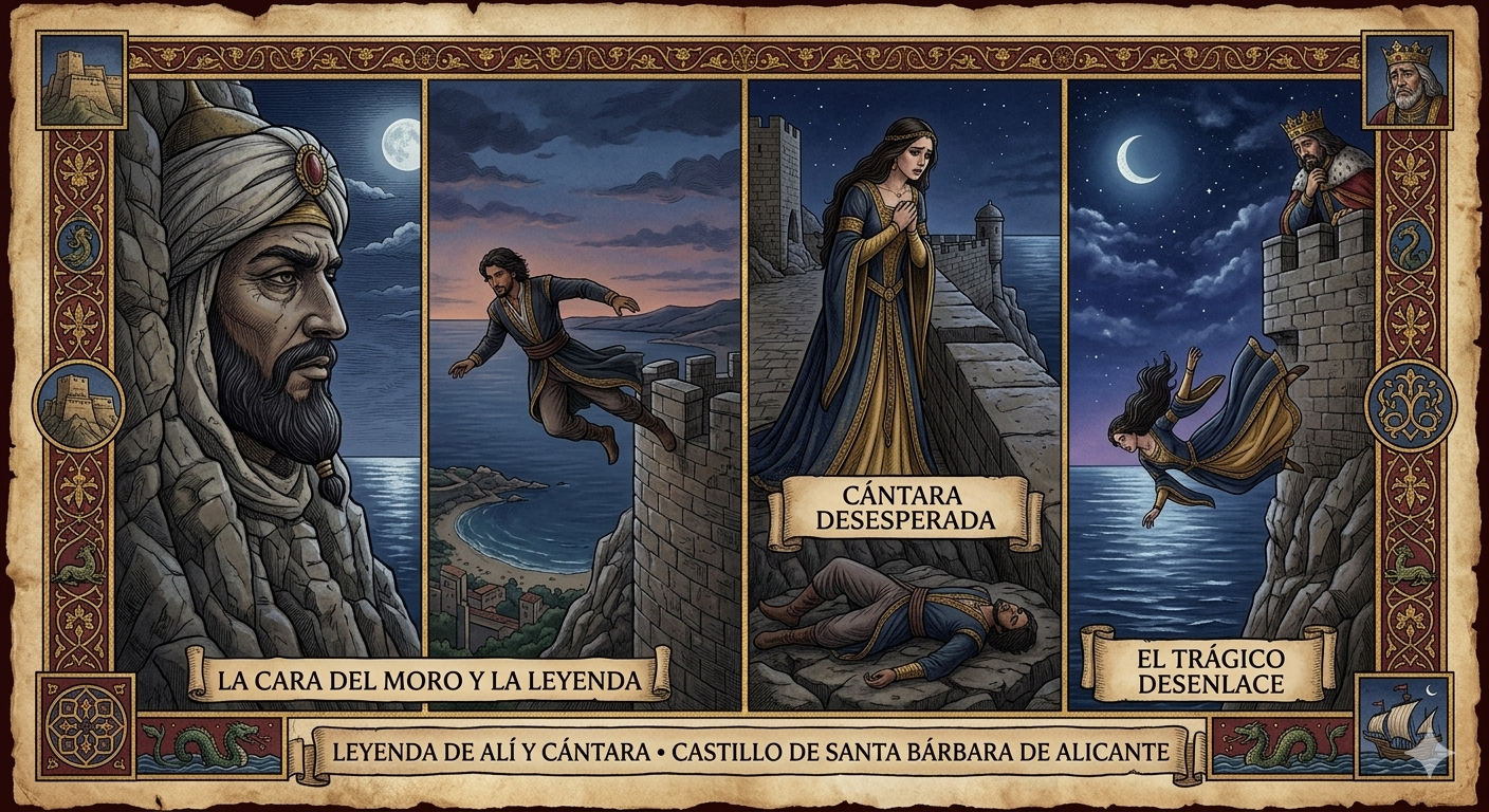 Cuentan que en ese momento quedó marcado para siempre el perfil del rostro del califa en la falda del Monte Benacantil. Por esta razón, los ciudadanos conmovidos por el romance decidieron unir los nombres de Alí y Cántara para denominar su población: Alicante.