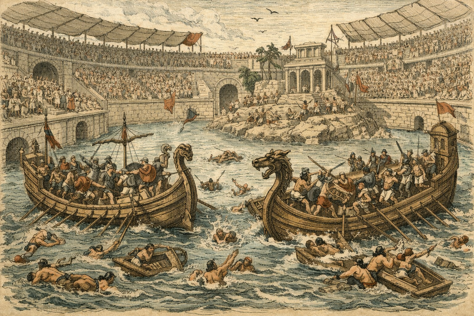 En los anfiteatros romanos se llevaban a cabo las famosas naumaquias, también se organizaban luchas de gladiadores y con animales salvajes e incluso era el lugar elegido para propinar los castigos a los prisioneros.